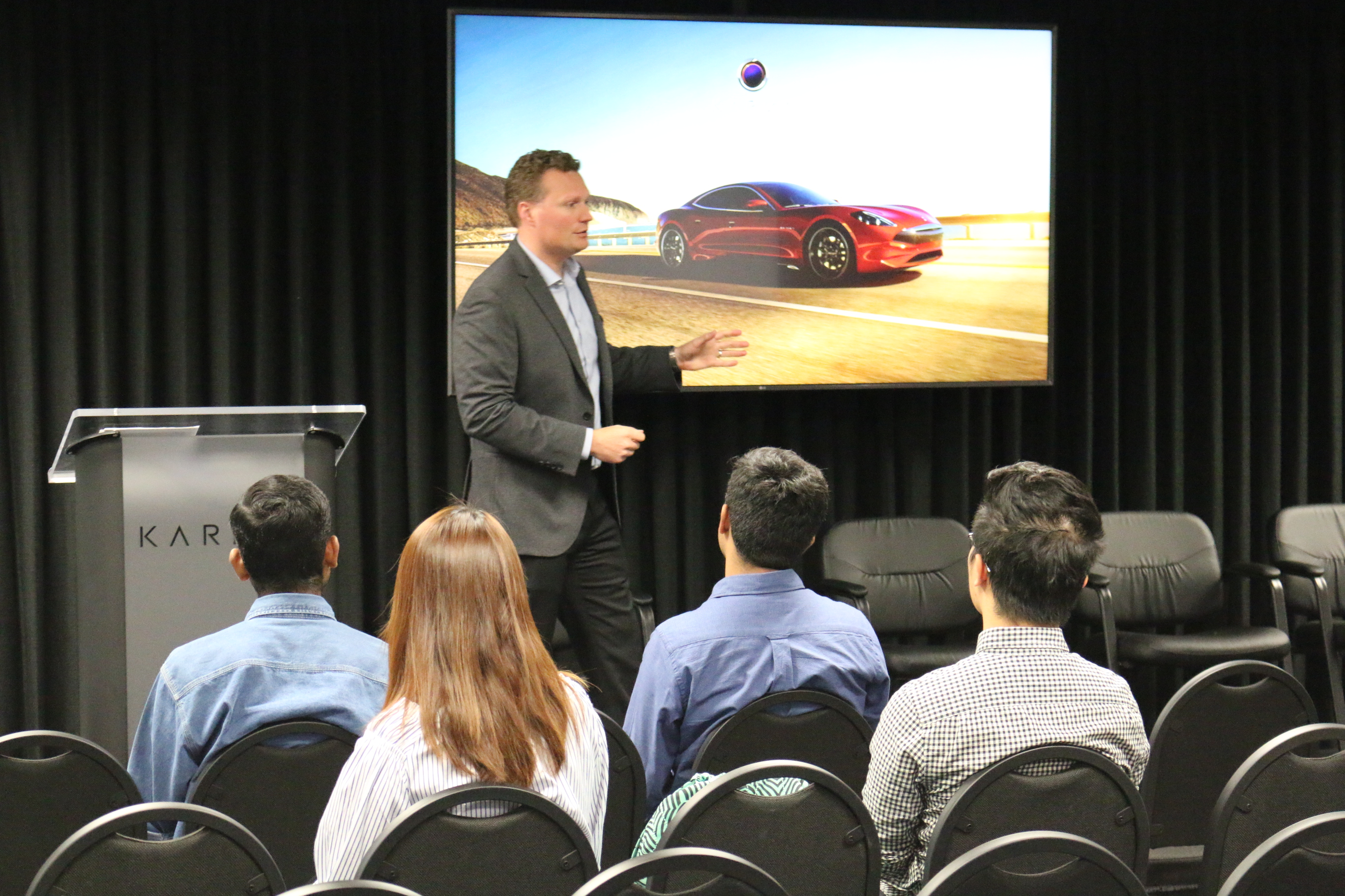 Following the facility tour, students sat down with Karma executives and former UCI and USC Karma alumni for a Q&A session. Engaging keynotes and interactive panel discussions featured Joost de Vries, Karma Vice President of Global Sales and Customer Experience, presenting Karma as an open-platform company. Daniel Bateson (current student in eMBA), also spoke on behalf of Karma to provide invaluable advice on career skillsets that will pave the road towards a successful career.